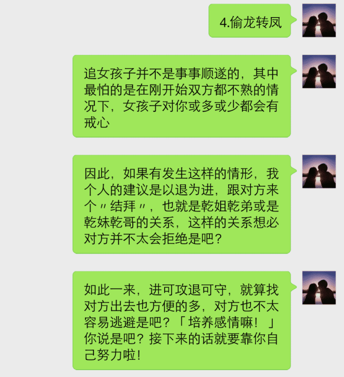 这四个恋爱技巧,单身的男人学会后,多去实践,实践出真知,熟练掌握之后,你会发现追女生原来是这么简单的事情,即使你不高不帅不富,一样能让女孩爱上你。这就是追女生套路的作用,比你一味的对女生好效果强的多了。