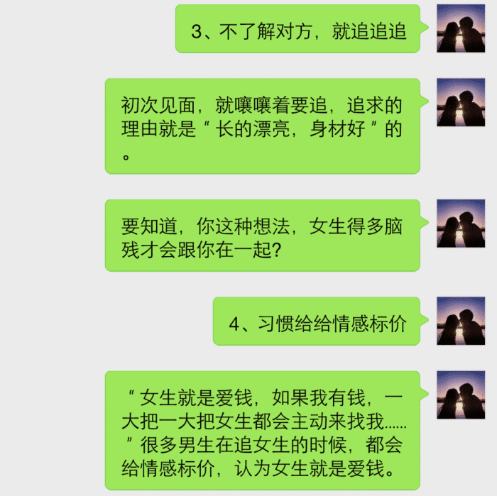 有些男人,和女生第一次见,就要去追女生,只看到女生长的漂亮身材好,你这种饥渴的表现,女生会被你吓跑。男人要在喜欢的女生面前表现出无所谓的态度,她才能被你吸引。很多男人,喜欢给女人贴标签,认为女生不是爱钱就是颜控,这种男人,活该单身了。