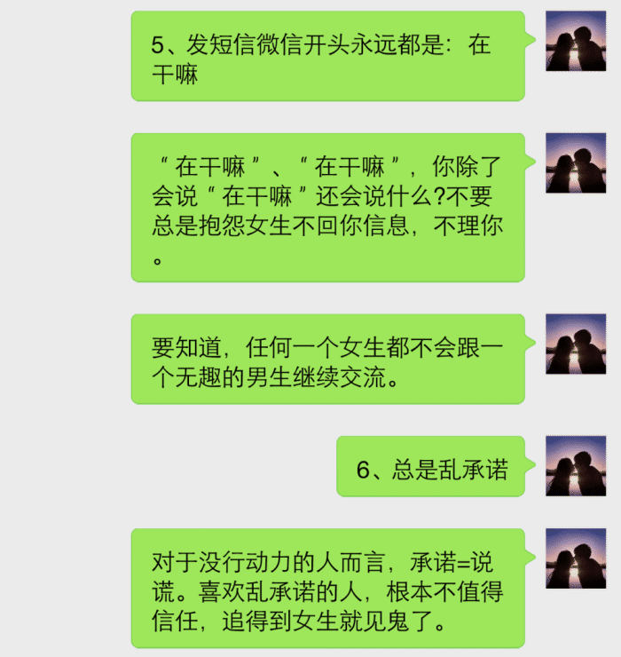 直男和女生聊天,开头永远是在干嘛,难怪女生不回你消息,千篇一律的问题,让女生感觉很无趣,甚至会反感你。还有些男人,整天给女生做承诺,画大饼,却从来不用行动去实现,试问女生怎么会喜欢你呢?难道你以为女生真的那么好骗吗?这些行为,女生非常反感,男人要注意不要做。