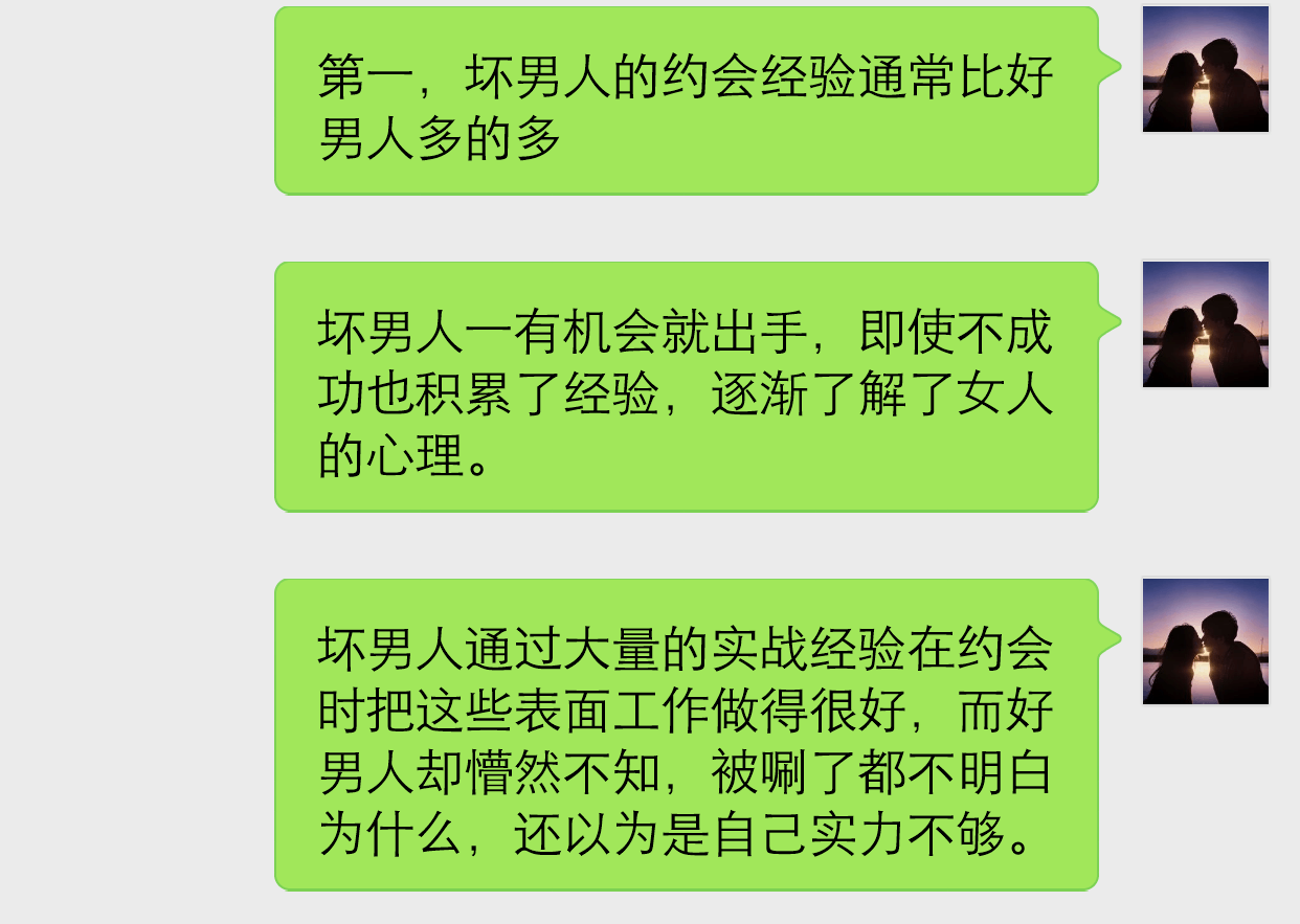 导语:都在说,男人不坏,女人不爱,现在的世道,好女孩都被坏男人骗走了,而这些女生,往往都是心甘情愿被渣男人骗,然后等她们玩累了,就找个老实人嫁了,这些所谓的好男人,老实人,为什么就得当接盘侠呢?现实生活中,总会遇到一些单身的男人,明明条件还可以,可就是找不到女朋友,他们往往还不知道自己单身的原因,今天,就跟大家分析,你是好男人,为什么你还单身?坏男人这么受女生欢迎,他到底比你强在哪里?