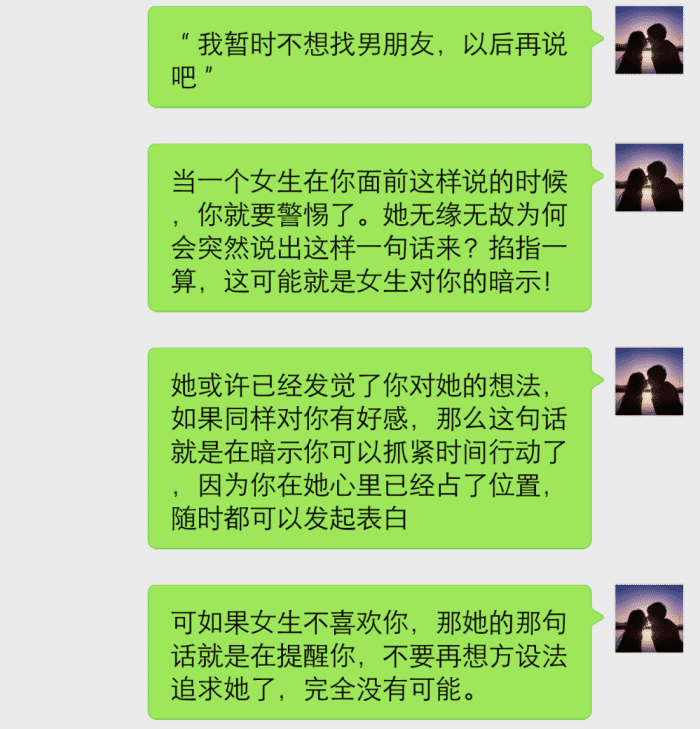当你喜欢一个女生,并且想要追求她的时候,女生会对你说:我暂时还不想谈恋爱,我只需做好工作。如果你真的信了,还在傻傻的等女生,你以为等她把这段时间忙完就会跟你谈恋爱吗?男人真是太天真,女人说这句话的意思就是,她不喜欢你,你们之间没有可能性,女人不是真的不想谈恋爱,她只是不想和你谈恋爱而已。