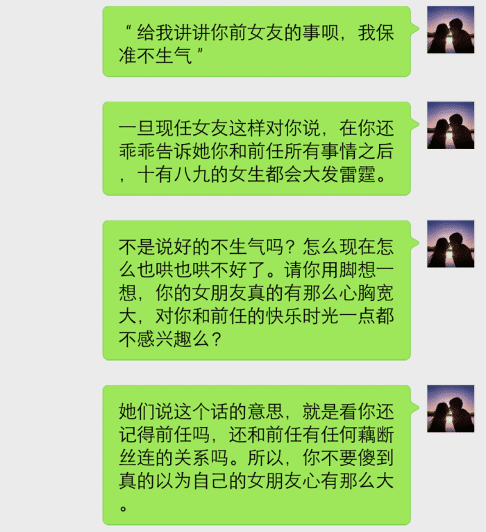 很多情侣,对彼此的前任都是比较敏感的,很多女人,为了骗男友说说前任的事情,会对他说:跟我说说前任呗,我肯定不会生气。这时候,如果男生真的傻傻的把什么都交代了,女生肯定会生气,就算她当时不会表现出来,在以后的感情生活中,她肯定会找各种各样的问题来挑你的刺,所以男人都要学聪明点,不要傻傻的听女生说什么就是什么。