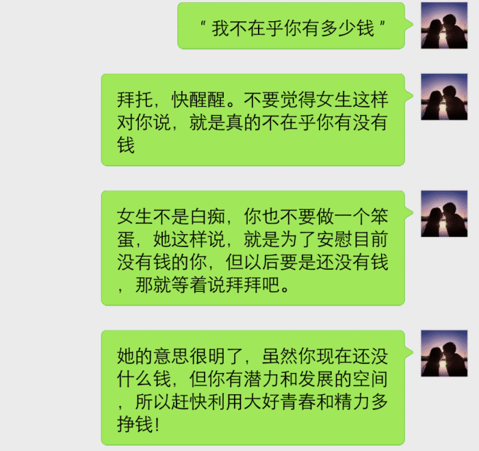 相信很多男人都听到女人说这句话:我不在乎你有没有钱。很多男人,听到女人这样说,感动的泪流满面,以为女生真的不在乎物质。其实是你理解错了,女人说这句话,并不代表她不在乎钱,她真实的意思是,你现在没钱没关系,但你要努力挣钱,如果你以后也没钱,她绝不会跟你走下去。不是女人拜金,而是爱情里,不能没有面包。