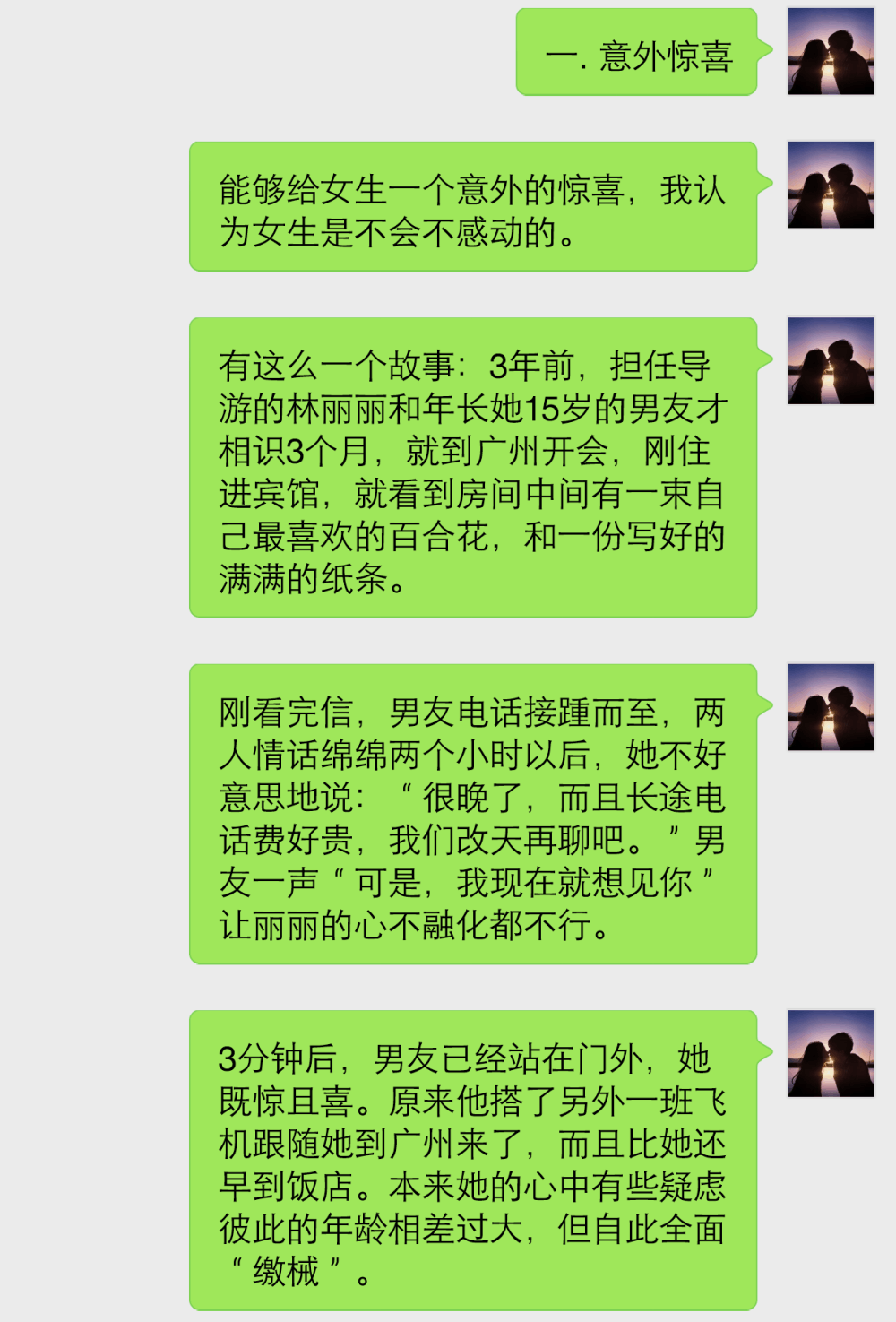 女生都喜欢意外的惊喜,这个故事里,男人充分抓住了这一点,这些事情,其实都非常简单,只需要男人多花点心思去做,就一定能达到这种效果,很多男人说自己不懂浪漫,不知道怎么制造意外的惊喜,其实这并不难,多去看看青春偶像剧,你就知道该怎么去做了,说白了还是看男人的决心。