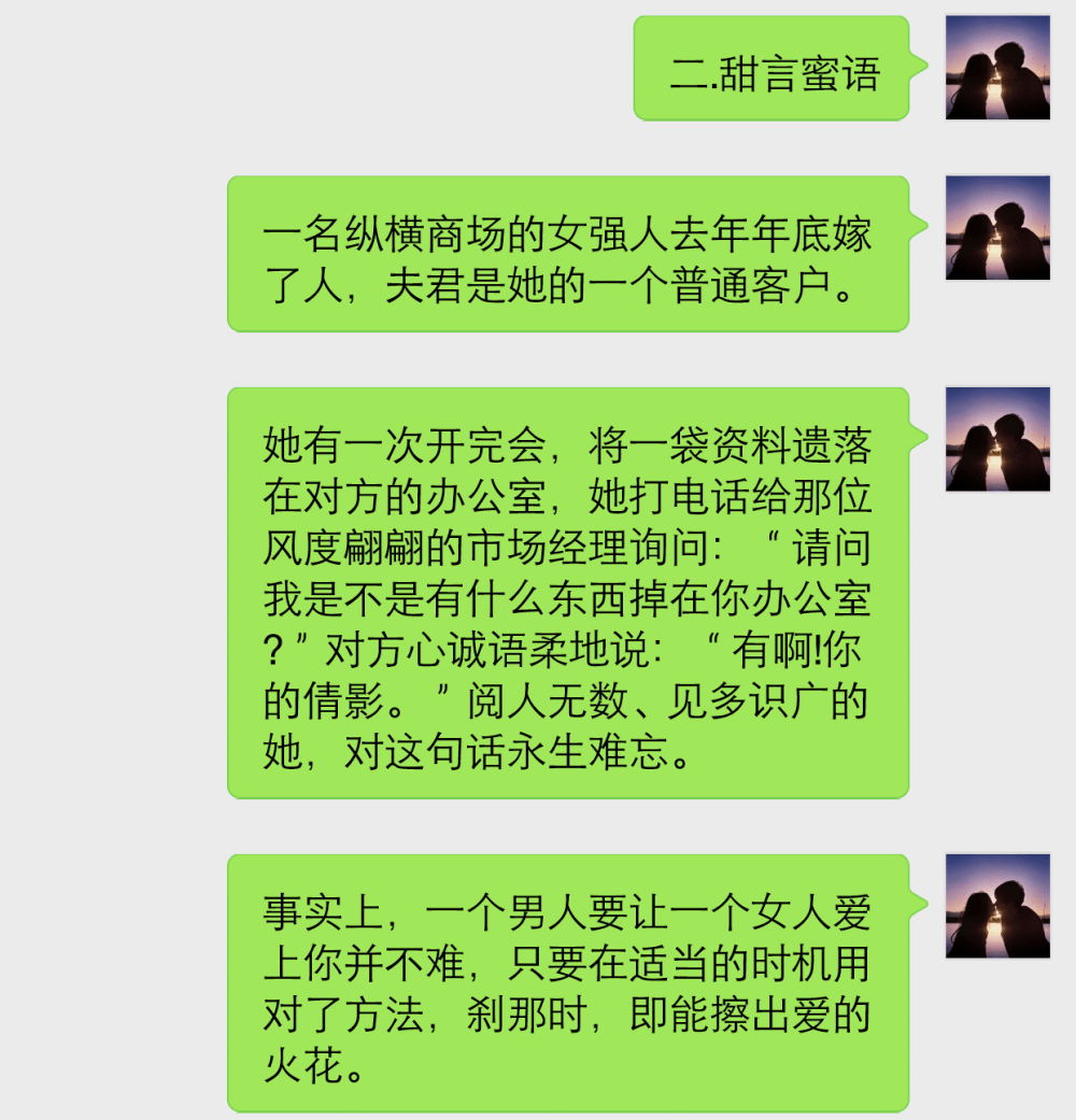 女人最喜欢的是甜言蜜语,男人可以没钱,可以长的不帅,如果不会说好听的情话,真的就很难让女生喜欢你,女人都是听觉动物,她们很感性,这也是为什么很多女生,很容易被坏男人骗,坏男人的花言巧语,几句话就把女生骗到手,这样的技能,难道你就不想拥有吗?只需多说几句肉麻的情话就可以了。