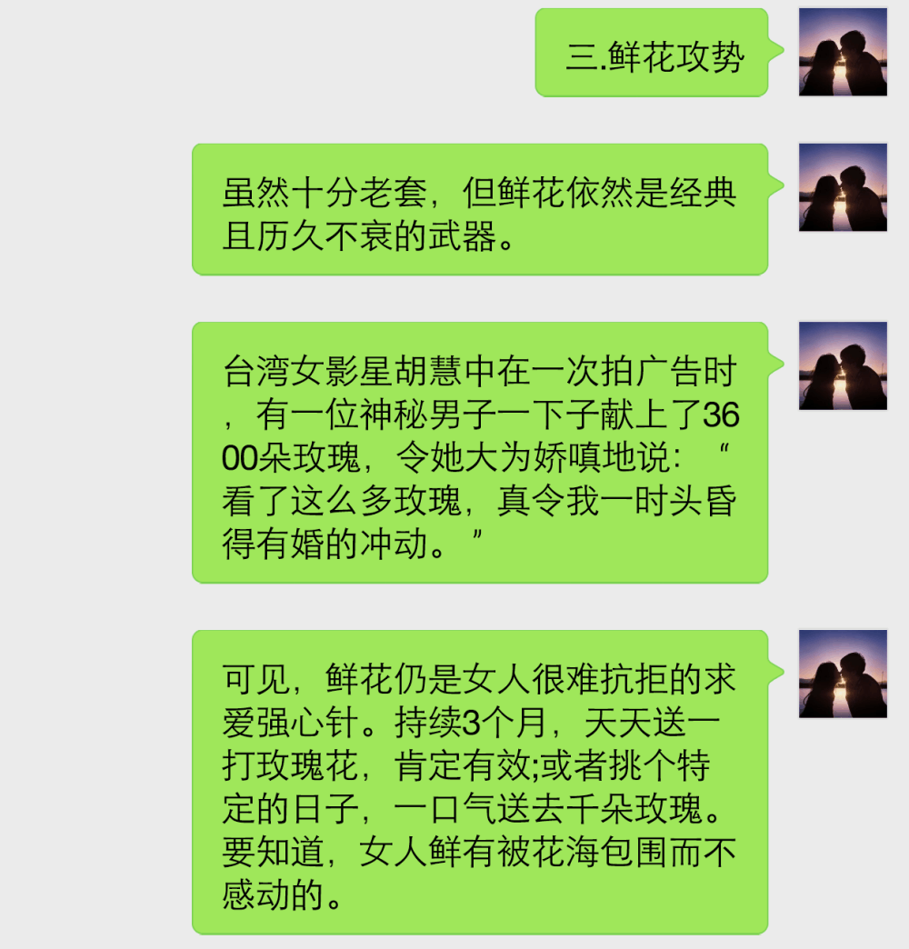 没有女人不喜欢鲜花的,如果不喜欢,那肯定是你送的种类不和她胃口。对于这种送花的套路,很多男人会觉得很老套,之所以会这样,那是因为真正去做的男人很少,所以他们也不知道有没有效果,然后就说这方法不行,也是活该单身了,女人要看的是男人的心意,送一次花很容易,难的是被女生拒绝后,还能坚持的去送花,女人怎能不喜欢你呢?