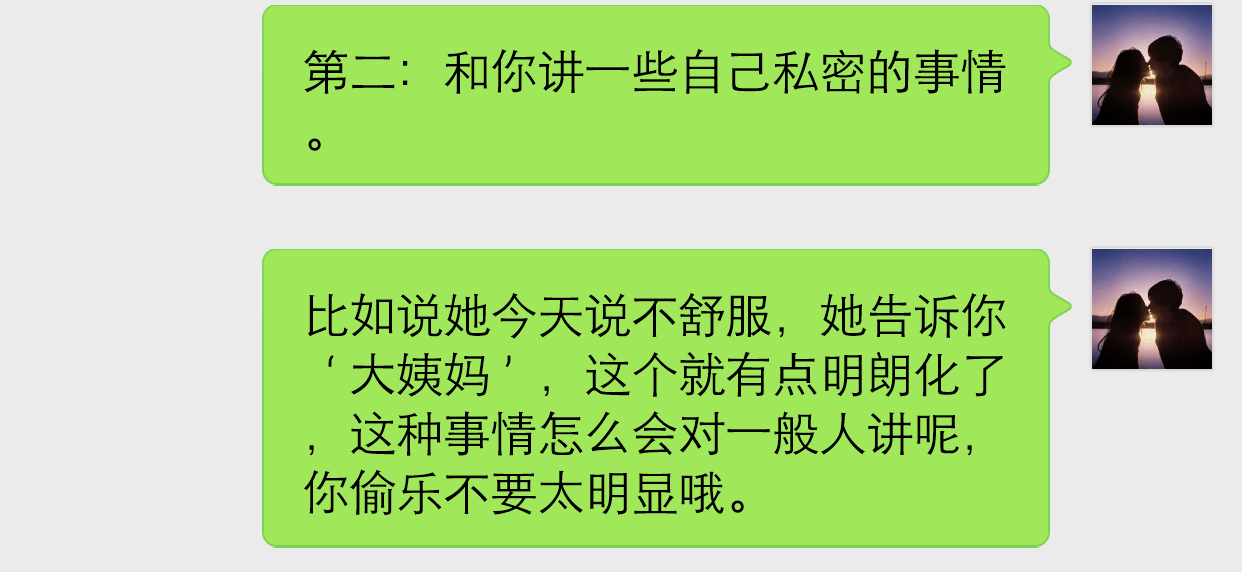 女生的个人隐私,一般只会在闺蜜之间说,而如果一个女生主动和你说有关于她的私密的事情,说明女生内心已经认可你了,一来她想你更加了解她,二来女生希望得到男人的关爱和照顾,男人不要傻傻的不知道,已经很明显了。