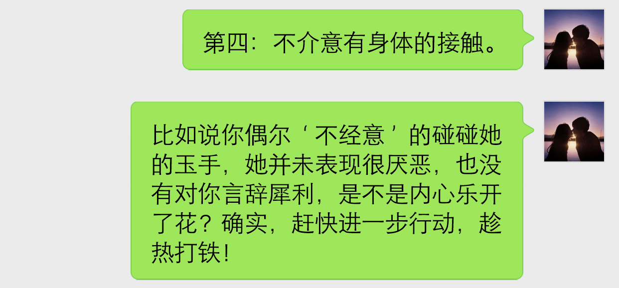 最后,当一个女生不介意你和她的肢体接触的时候,她已经默许你了,男人如果还不知道出动出击,真的是活该单身了,女人对于这个是最为反感,而她会跟你无意间来些肢体的碰触,已经是在暗示男人了,作为男人,就应该主动站出来。