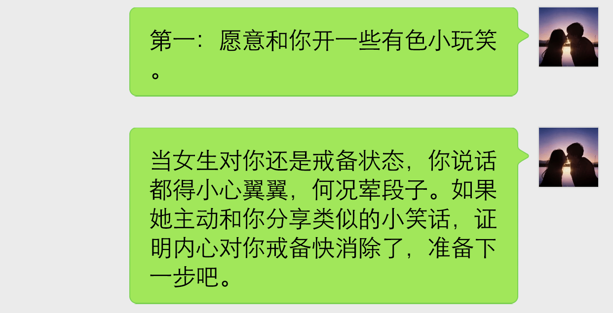 作为女生,一般都是会很排斥男人跟自己开些小玩笑的,除非是女生内心深处接受了你,那么对你说的话,不管是小段子,或是调戏她的套路,女生都不会反感,甚者有些女生会主动和你讲些小段子,这时候,说明女生已经对你很有好感了。