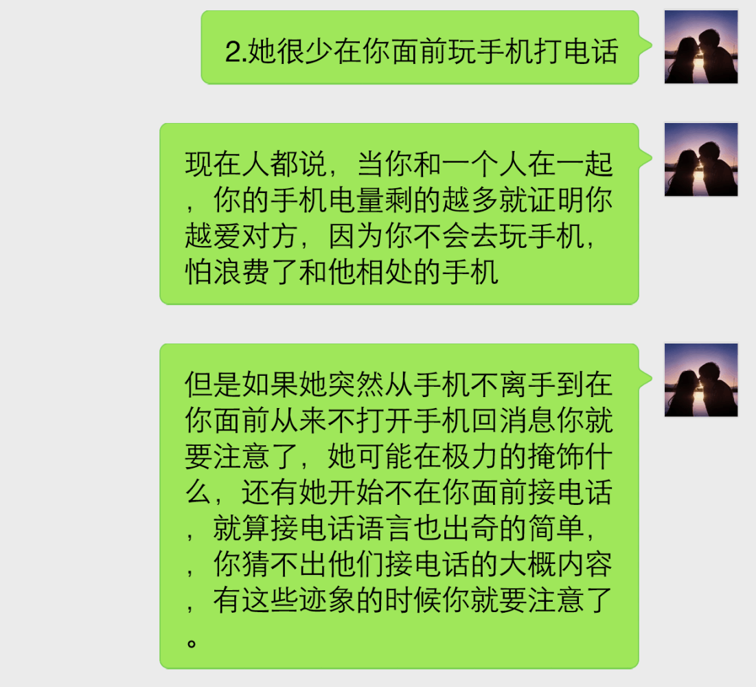越是心里有鬼的女生,越是不会在你面前玩手机,因为她知道,如果在你面前频繁的聊天发短信,男人肯定会起疑心,所以她很少在你面前用手机,企图来掩饰自己,如果你的女人,以前是离不开手机的,现在却从不在你面前玩手机,打电话也不在你面前,她心里一定是有鬼了。