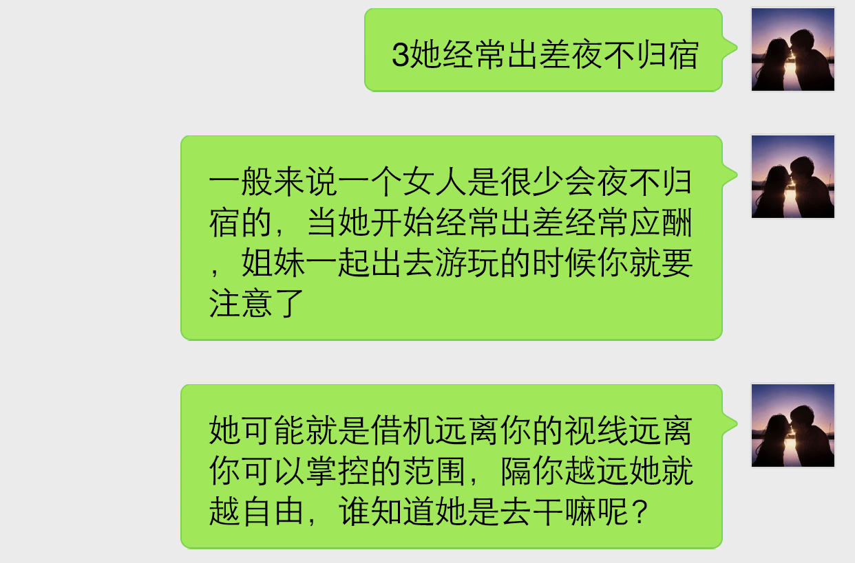 女人原本工作不需要出差,突然在某一段时间里,她出差的频率很高,而且经常不在家过夜,男人就要留个心眼了,女人很可能并不是真的出差了,她可能瞒着你去跟别的男人幽会了,男人被绿了还不知道,这是最可恨的。