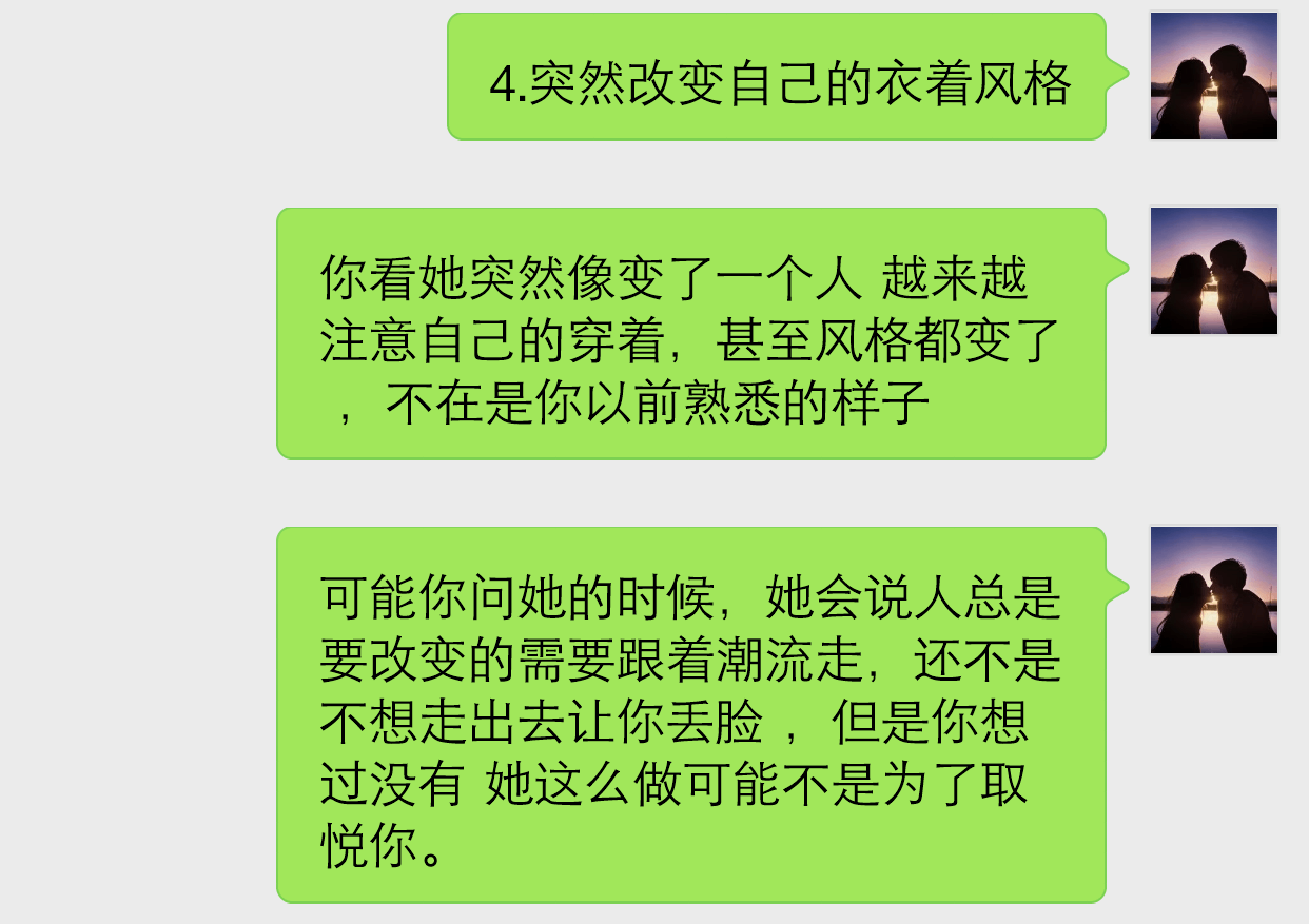 如果一个女人突然改变自己的穿衣风格,很有可能有别的男人了,可能别的男人更喜欢她不一样的一面,于是女人为他而改变,很多男人傻傻的以为女人是为了取悦自己,现实却很残酷,女人有这些表现,男人要注意一下,不然被绿还不知道就很可悲了。