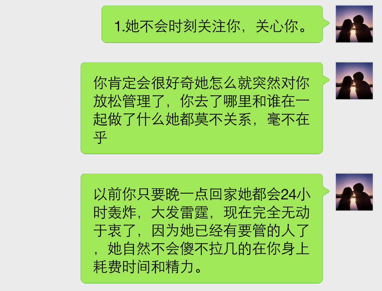 女人原本很关心你,你的一举一动都牵动着她的心,然而现在,女人却从不在意你做了些什么,好像你不存在一样,就算你回家晚了,或是做了一些她以前不允许你做的事情,她也不会生气,当作没看见一样,这时候,男人就要想一想了,她心里还有没有你,她的关心和爱意都给谁了。
