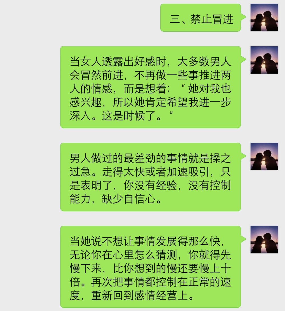 很多男人,和女人交往的过程中,总是会过早的暴露自己对女人的爱意,过早的向女生表白,你以为这是在加速你们的感情,其实你是在埋葬你们的感情,过早的表白会让你们的感情还没萌芽就胎死腹中,多么可惜,所以男人一定要耐住性子,再喜欢也不要表达出来。