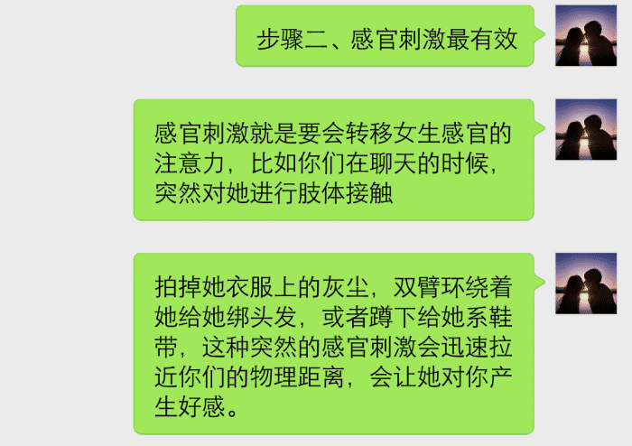 男女之间相处,感官的刺激是最有效的,很多老实人就是不会这一点,他们总是不敢去和女生有肢体接触,更不敢去调戏女生,看看坏男人,和女生打情骂俏,调戏女生,女生还很喜欢他。这种肢体的接触,会让女人更渴望爱情,容易产生一种恋爱的感觉。