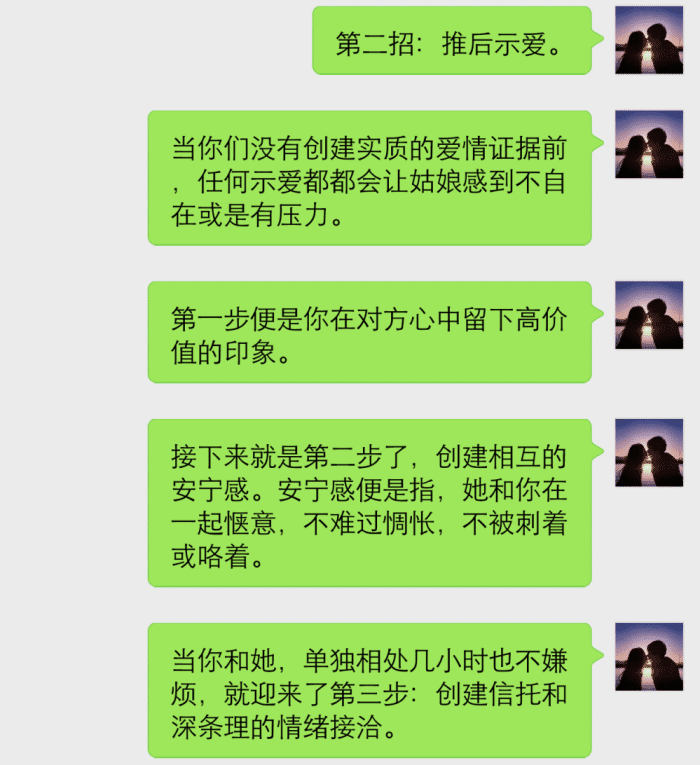 再者,千万不要去跟女孩子表白,过早的表白,就是在告诉女生拒绝你,聪明的男人,只会等到和女生有实质性的感情基础后,再去和女生示爱,这只是一个形式而已,男人不要想着通过表白,通过说几句我爱你,就能让女生爱上你,这是不现实的,正确的做法是先吸引女人。
