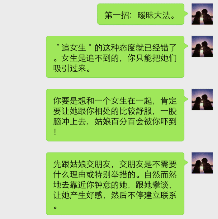 首先是暧昧大法,很多男人,总是想着去追女生,其实女人不是追来的,而是吸引来的,你再怎么追,再怎么为她付出,也是追不到的。与其傻傻的去追,不如通过跟女生暧昧,吸引她,当你们感情升温到一定程度的时候,一切都是水到渠成,根本不需要去追。