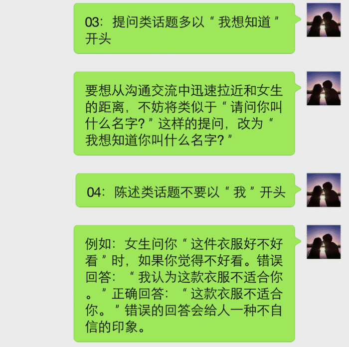 当你向女生提问的时候,不要直接去问,而是换一种方式,以我想知道开头,女生听到你这样的提问,会有一种亲切感,你们直接的距离就会拉近。再者,回答女生的问题,不要以我字开头,不要小看这一个我字,它能暴露你内心不够自信,而女生都喜欢自信的男人。