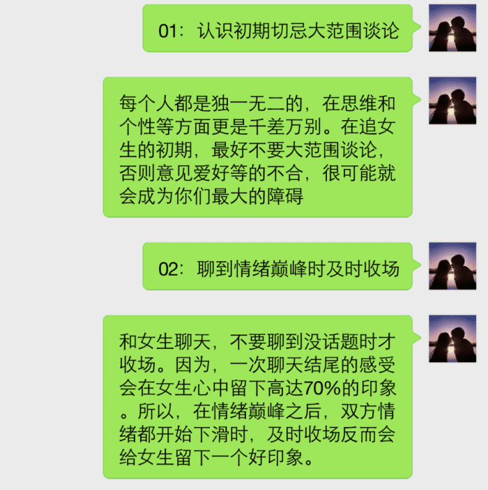 在和女生认识的初期,不要大范围的去讨论一些事情,因为两个人并不了解,可能有很多意见不合的地方,而这种不合,会让女生觉得你们不合适,你也就没机会进一步发展了。这个时候,男人要和女生聊一些双方共同的认知的话题,比如共同的兴趣爱好等。再者,聊天要及时收场,不要一直聊到没有话题可聊了,再尴尬的结束聊天。