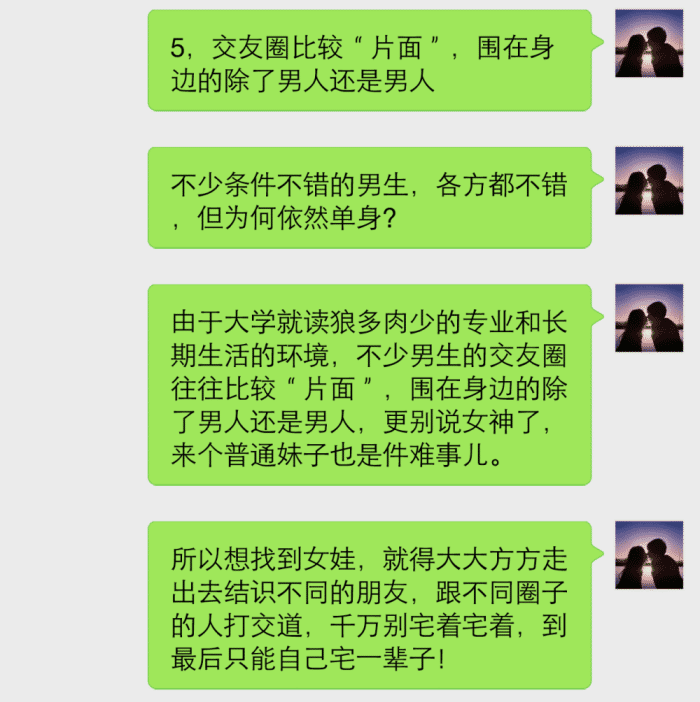 还有些男人,身边只有男性朋友,一个异性朋友都没有,生活圈子很小,从来不会想着走出去,多认识一些女生,你连女性朋友都没有,怎么可能会有女朋友呢?这五个误区,很多单身的男人经常会犯,如果不注意这些问题,还要单身下去。