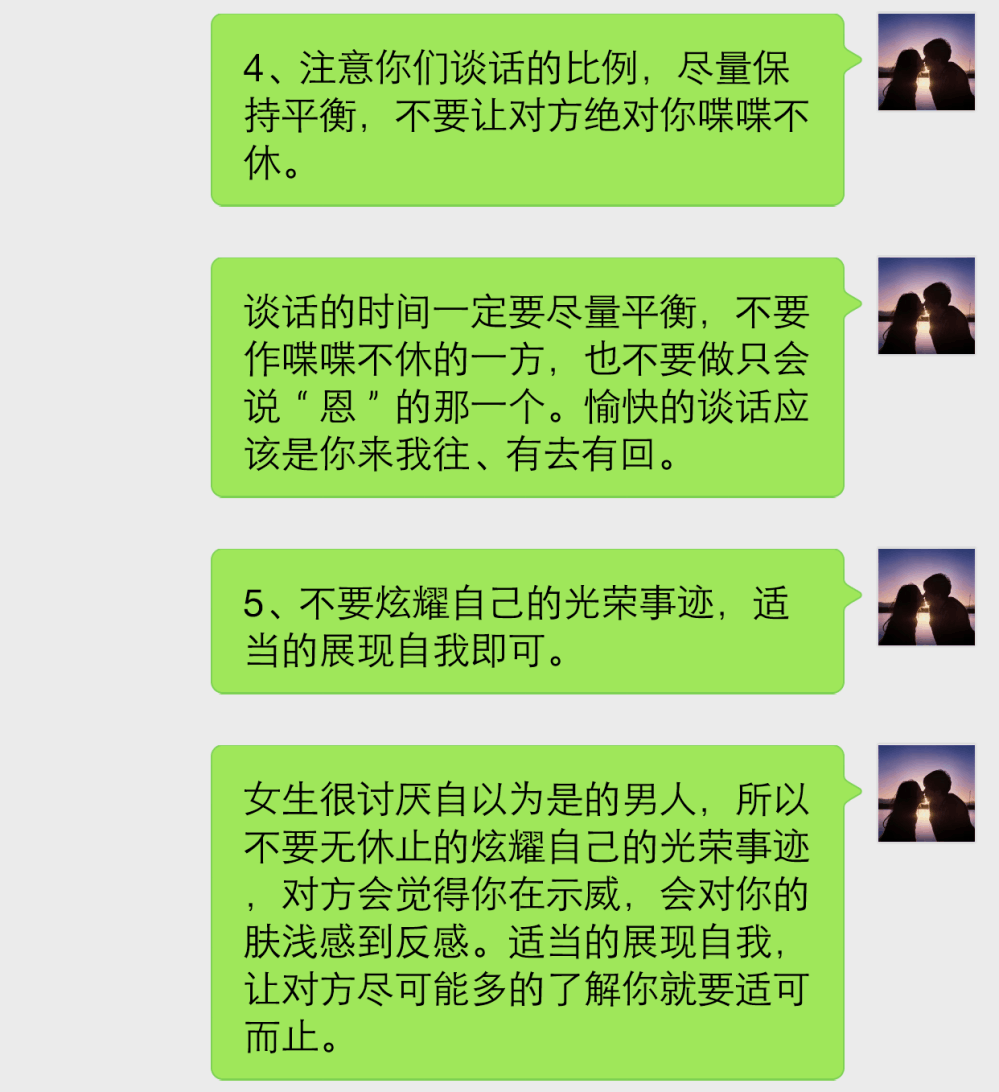 第二个:注意你们谈话的比例,尽量保持平衡,不要让对方觉得你喋喋不休。