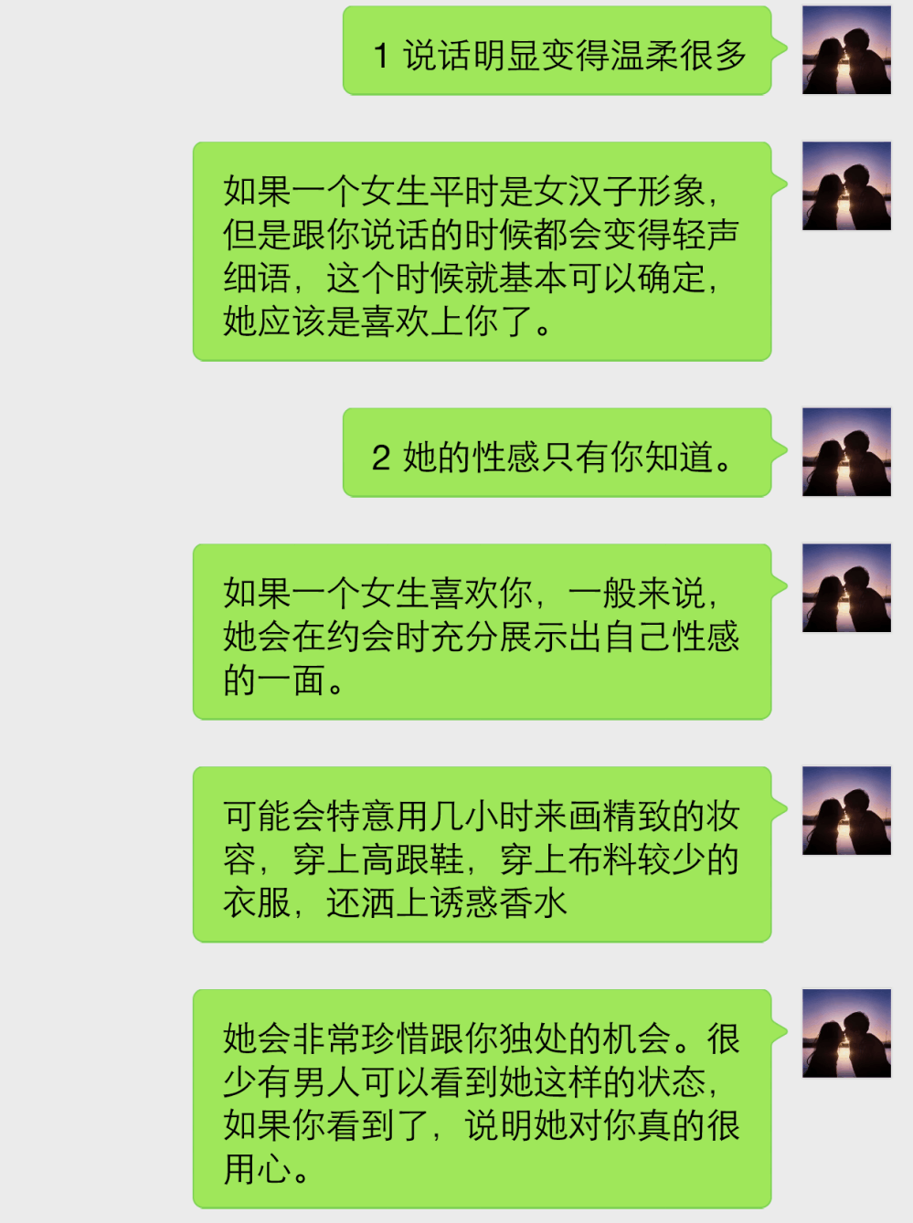 现在很多女生外表都是女汉子,那只是她们没遇到喜欢的男生,在喜欢的男人面前,女汉子也会变得小鸟依人,女生对你说话会变得温柔许多。再者,女人只会在你面前展现她的身材,和你独处的时候,她会精心打扮,把最好的自己展现在你面前。