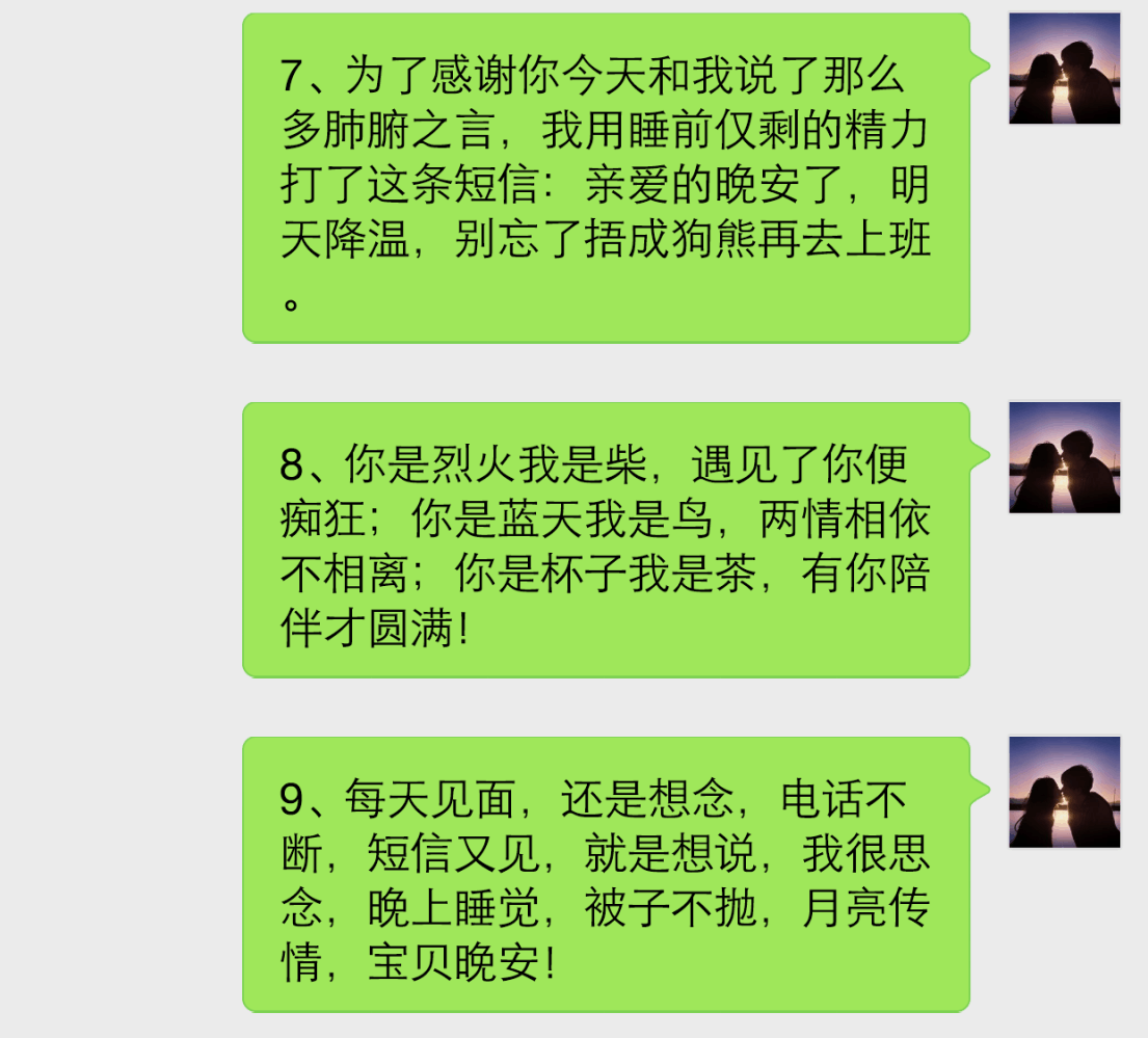 第三句:你是烈火我是柴,遇见了你便痴狂;你是蓝天我是鸟,两情相依不相离;你是杯子我是茶,有你陪伴才圆满!男人一定要记得多和女生说情话,会有意想不到的效果,男女之间很多问题都能轻松解决,这就是情话的利用所在。